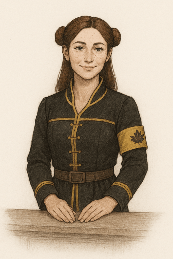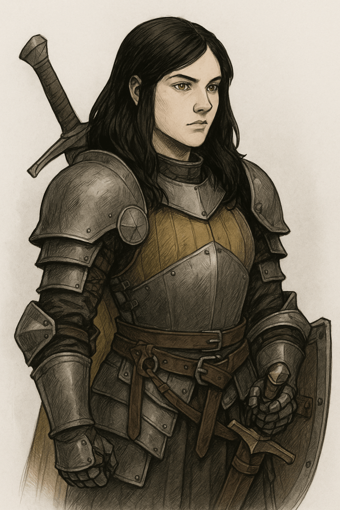 Aunque poseía la fuerza y el porte de un guerrero curtido, sus rasgos femeninos y la delicadeza de su rostro resaltaban con naturalidad. El cabello negro caía hasta sus hombros, enmarcando unos ojos color miel que brillaban con determinación. Su expresión revelaba experiencia y habilidad. Portaba una armadura completa con detalles en tono ocre que le daban un aire tan distinguido como intimidante.