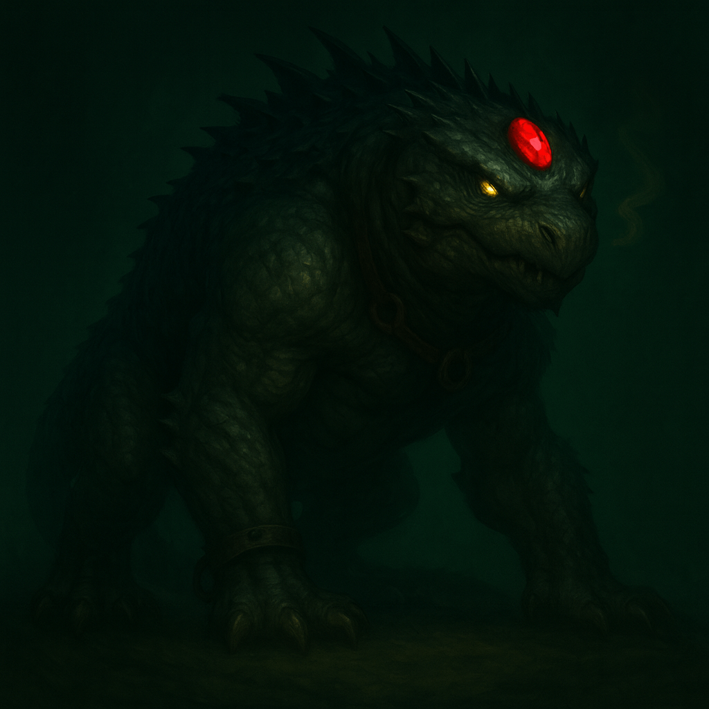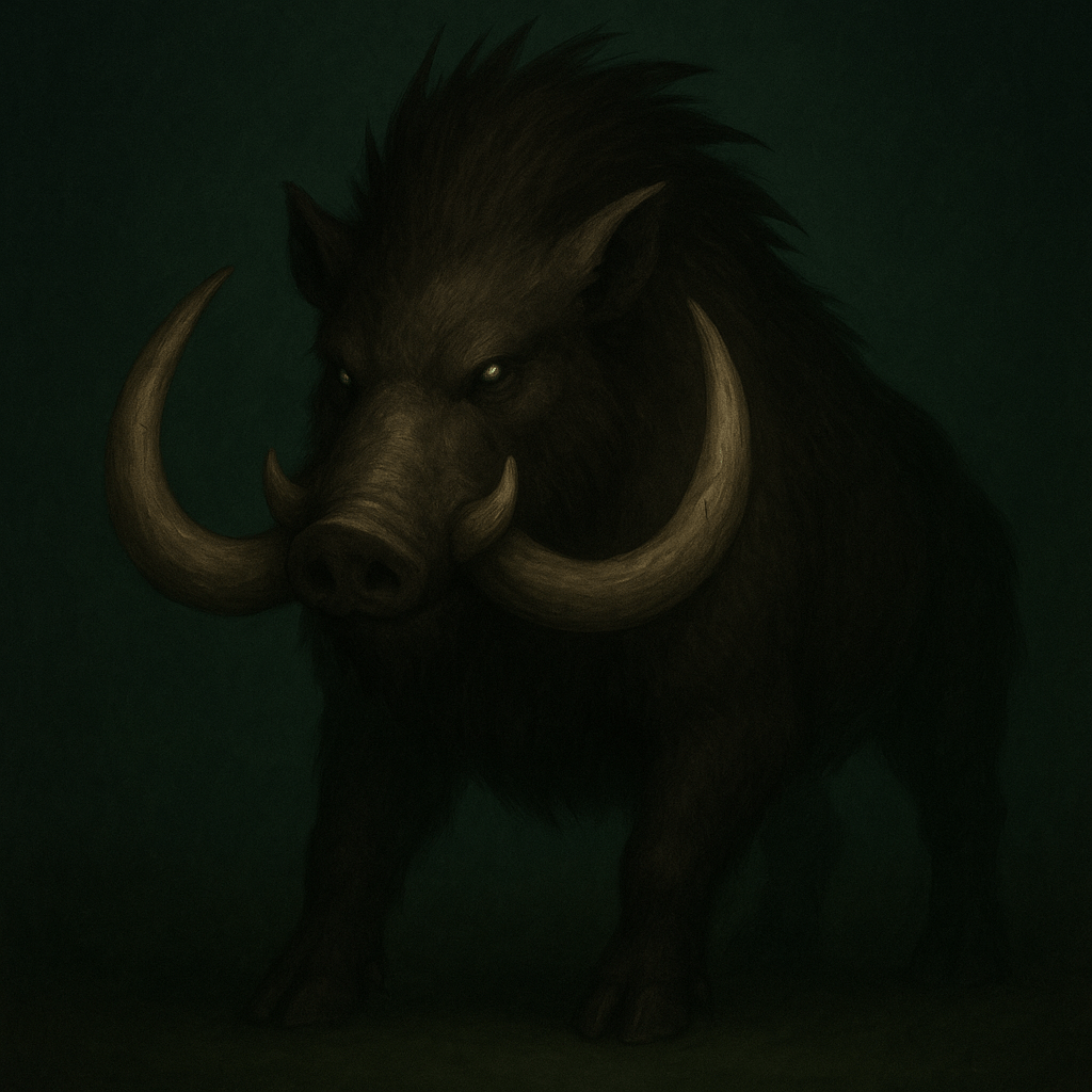 La criatura tenía el cuerpo de un jabalí común, pero su tamaño era descomunal, tan grande como una cabaña de madera. Dos colmillos curvados hacia adelante sobresalían de su cabeza como lanzas naturales. Todo su cuerpo estaba cubierto de un pelaje corto y áspero, salvo en la espalda, donde se erizaba una melena más larga que le daba un aspecto aún más salvaje.