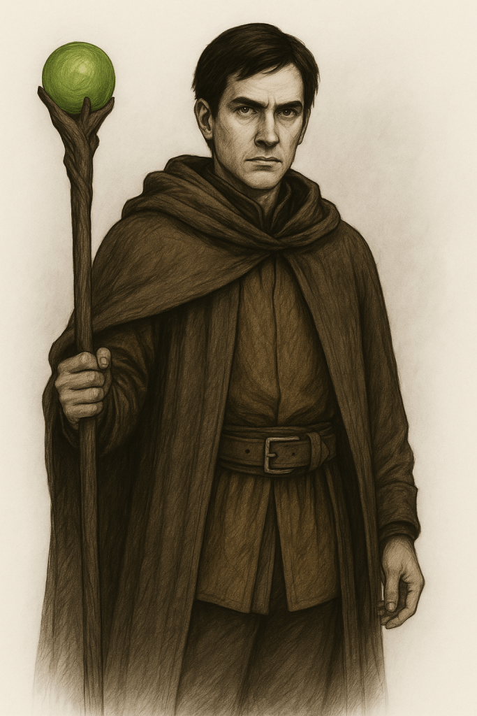 Kaydo era de tez pálida y ojos verde oscuro, hundidos bajo ojeras marcadas. Sus vestimentas estaban hechas en distintas tonalidades de marrón, simples y funcionales, más pensadas para la resistencia del viaje que para la ostentación. El cabello, de un café oscuro y bastante bien ordenado, enmarcaba un rostro sereno y concentrado en el combate.