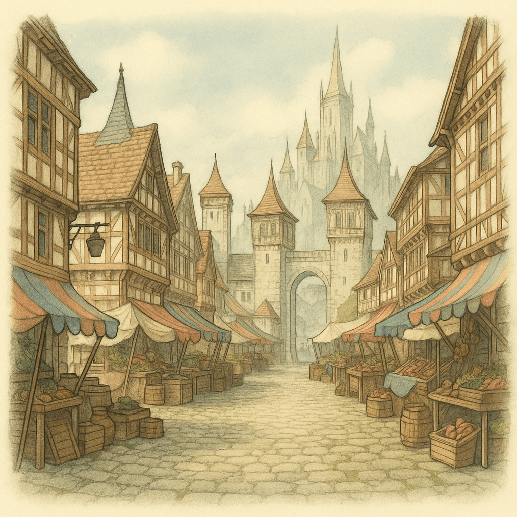 Endo se despidió de Frelda y sus compañeros y partió hacia el mercado. Este se ubicaba en una gran plaza al sur de la capital.