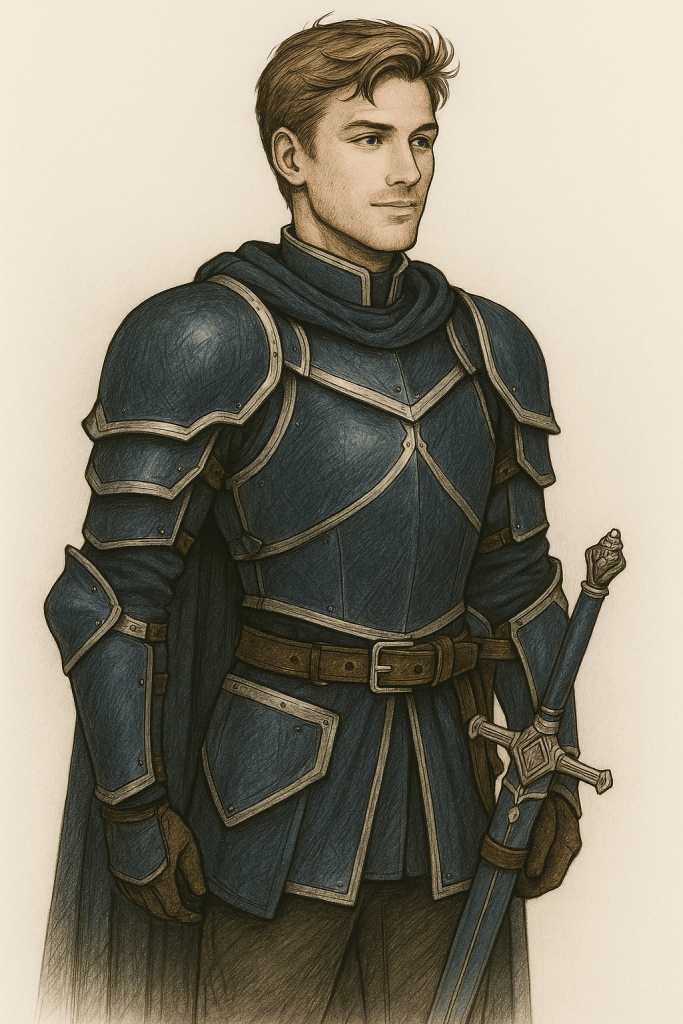 Su cabello castaño claro y sus ojos de un azul verdoso llamaban la atención tanto como su porte noble. La armadura que portaba revelaba sin esfuerzo su origen acomodado: una pieza de trabajo refinado, de un azul oscuro profundo con bordes y detalles blancos. No era una armadura pesada como la de Frelda, sino una de mallas flexibles que le permitía saltar, girar y ejecutar piruetas con facilidad.